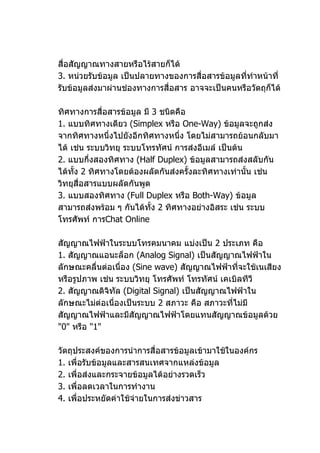 อาจจะเป็นคนหรือวัตถุก็ได้ ทิศทางการสื่อสารข้อมูล มี 3 ชนิดคือ 1. แบบทิศทางเดียว (Simplex หรือ One-Way) ข้อมูลจะถูกส่ง จากทิศทางหนึ่งไปยังอีกทิศทางหนึ่ง โดยไม่สามารถย้อนกลับมา ได้ เช่น ระบบวิทยุ ระบบโทรทัศน์ การส่งอีเมล์ เป็นต้น 2. แบบกึ่งสองทิศทาง (Half Duplex) ข้อมูลสามารถส่งสลับกัน ได้ทั้ง 2 ทิศทางโดยต้องผลัดกันส่งครั้งละทิศทางเท่านั้น เช่น วิทยุสื่อสารแบบผลัดกันพูด 3. แบบสองทิศทาง (Full Duplex หรือ Both-Way) ข้อมูล สามารถส่งพร้อม ๆ กันได้ทั้ง 2 ทิศทางอย่างอิสระ เช่น ระบบ โทรศัพท์ การChat Online สัญญาณไฟฟ้าในระบบโทรคมนาคม แบ่งเป็น 2 ประเภท คือ 1. สัญญาณแอนะล็อก (Analog Signal) เป็นสัญญาณไฟฟ้าใน ลักษณะคลื่นต่อเนื่อง (Sine wave) สัญญาณไฟฟ้าที่จะใช้เนเสียง หรือรูปภาพ เช่น ระบบวิทยุ โทรศัพท์ โทรทัศน์ เคเบิลทีวี 2. สัญญาณดิจิทัล (Digital Signal) เป็นสัญญาณไฟฟ้าใน ลักษณะไม่ต่อเนื่องเป็นระบบ 2 สภาวะ คือ สภาวะที่ไม่มี สัญญาณไฟฟ้าและมีสัญญาณไฟฟ้าโดยแทนสัญญาณข้อมูลด้วย "0" หรือ "1" วัตถุประสงค์ของการนาการสื่อสารข้อมูลเข้ามาใช้ในองค์กร 1. เพื่อรับข้อมูลและสารสนเทศจากแหล่งข้อมูล 2. เพื่อส่งและกระจายข้อมูลได้อย่างรวดเร็ว 3. เพื่อลดเวลาในการทางาน 4. เพื่อประหยัดค่าใช้จ่ายในการส่งข่าวสาร