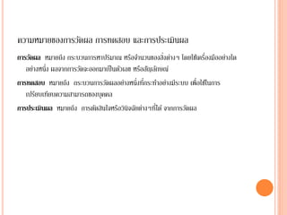 ่ ่ การวัดผล หมายถึง กระบวนการหาปริมาณ หรือจานวนของสิงต่างๆ โดยใช้เครืองมืออย่างใด อย่างหนึ่ง ผลจากการวัดจะออกมาเป็ นตัวเลข หรือสัญลักษณ์ การทดสอบ หมายถึง กระบวนการวัดผลอย่างหนึ่งทีกระทาอย่างมีระบบ เพื่อใช้ในการ ่ เปรียบเทียบความสามารถของบุคคล ่ การประเมินผล หมายถึง การตัดสินใจหรือวินิจฉัยต่างๆทีได้ จากการวัดผล