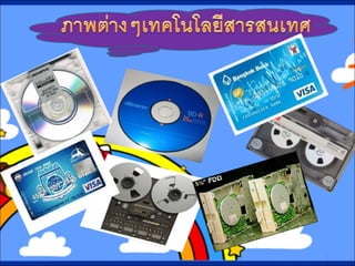 งานนำเสนอบทที่2 1. 2. 3. 1. เทคโนโลยีที่ใช้ในการเก็บข้อมูล เช่น ดาวเทียมถ่ายภาพทางอากาศ , กล้องดิจิทัล , กล้องถ่ายวีดีทัศน์ , เครื่องเอกซเรย์ ฯลฯ 2. เทคโนโลยีที่ใช้ในการบันทึกข้อมูล จะเป็นสื่อบันทึกข้อมูลต่าง ๆ เช่น เทปแม่เหล็ก , จานแม่เหล็ก , จานแสงหรือจานเลเซอร์ , บัตรเอทีเอ็ม ฯลฯ 3. เทคโนโลยีที่ใช้ในการประมวลผลข้อมูล ได้แก่ เทคโนโลยีคอมพิวเตอร์ทั้งฮาร์ดแวร์ และซอฟต์แวร์ 4. เทคโนโลยีที่ใช้ในการแสดงผลข้อมูล เช่น เครื่องพิมพ์ , จอภาพ , พลอตเตอร์ ฯลฯ 5. เทคโนโลยีที่ใช้ในการจัดทำสำเนาเอกสาร เช่น เครื่องถ่ายเอกสาร , เครื่องถ่ายไมโครฟิล์ม 6. เทคโนโลยีสำหรับถ่ายทอดหรือสื่อสารข้อมูล ได้แก่ ระบบโทรคมนาคมต่าง ๆ เช่น โทรทัศน์ , วิทยุกระจายเสียง , โทรเลข , เทเล็กซ์ และระบบเครือข่ายคอมพิวเตอร์ทั้งระยะใกล้และไกล 4. 5. 6. การพัฒนาเทคโนโลยีสารสนเทศจนสามารถนำมาใช้ประโยชน์ได้อย่างมากมาย นับได้ว่าเป็นยุคของเทคโนโลยีสารสนเทศ หรือยุคข้อมูลข่าวสาร ซึ่งก่อให้เกิดประโยชน์ต่อมวลมนุษย์อย่างมหาศาล ยังผลทำให้เกิดการเปลี่ยนแปลง การเปลี่ยนแปลงอะไรก็ตาม ย่อมมีผลกระทบต่อบุคคล องค์กร หรือสังคม เราสามารถจำแนกผลกระทบของเทคโนโลยีสารสนเทศออกเป็นสองด้าน คือ ผลกระทบด้านบวก และผลกระทบด้านลบ การกำเนิดของคอมพิวเตอร์เมื่อประมาณห้าสิบกว่าปีที่แล้ว เป็นก้าวสำคัญที่นำไปสู่ยุคสารสนเทศ ในช่วงแรกมีการนำเอาคอมพิวเตอร์มาใช้เป็นเครื่องคำนวณ แต่ต่อมาได้มีความพยายามพัฒนาให้คอมพิวเตอร์เป็นอุปกรณ์สำคัญสำหรับการจัดการข้อมูล เมื่อเทคโนโลยีอิเล็กทรอนิกส์ได้ก้าวหน้ามากขึ้น ทำให้สามารถสร้างคอมพิวเตอร์ที่มีขนาดเล็กลง แต่ประสิทธิภาพสูงขึ้น สภาพการใช้งานจึงใช้งานกันอย่างแพร่หลาย ผลของเทคโนโลยีสารสนเทศที่มีต่อชีวิตความเป็นอยู่และสังคมจึงมีมาก มีการเรียนรู้และใช้สารสนเทศกันอย่างกว้างขวาง 7. 1. การสร้างเสริมคุณภาพชีวิตที่ดีขึ้น สภาพความเป็นอยู่ของสังคมเมือง มีการพัฒนาใช้ระบบสื่อสารโทรคมนาคม เพื่อติดต่อสื่อสารให้สะดวกขึ้น มีการประยุกต์มาใช้กับเครื่องอำนวยความสะดวกภายในบ้าน เช่น ใช้ควบคุมเครื่องปรับอากาศ ใช้ควมคุมระบบไฟฟ้าภายในบ้าน เป็นต้น 8. 2. เสริมสร้างความเท่าเทียมในสังคมและการกระจายโอกาส เทคโนโลยีสารสนเทศทำให้เกิดการกระจายไปทั่วทุกหนแห่ง แม้แต่ถิ่นทุรกันดาร ทำให้มีการกระจายโอกาสการเรียนรู้ มีการใช้ระบบการเรียนการสอนทางไกล การกระจายการเรียนรู้ไปยังถิ่นห่างไกล นอกจากนี้ในปัจจุบันมีความพยายามที่จะใช้ระบบการรักษาพยาบาลผ่านเครือข่