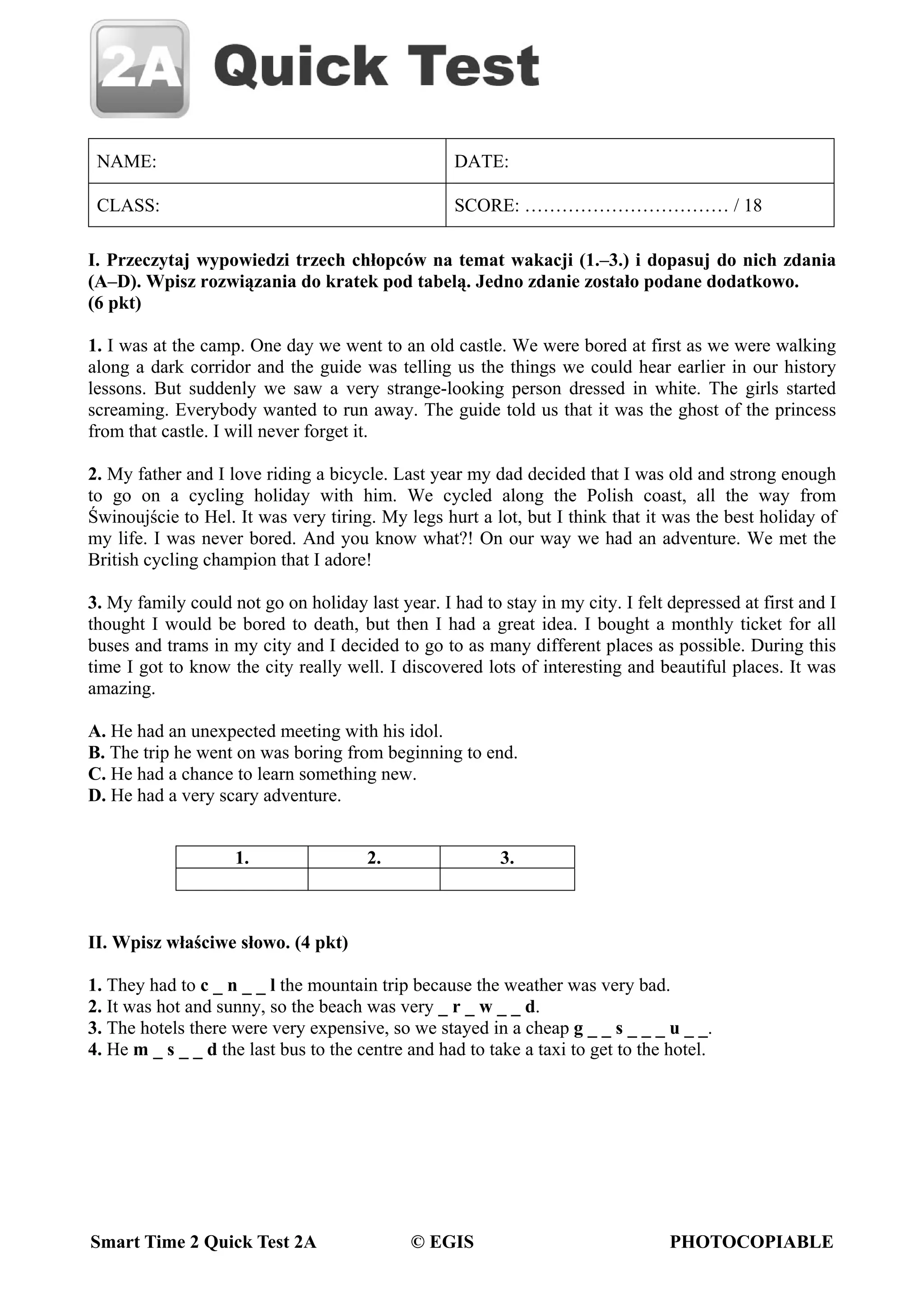 1) Matching three boys' statements about their holidays to sentences describing their experiences. One boy had a scary adventure, one had an unexpected meeting, and one learned something new.