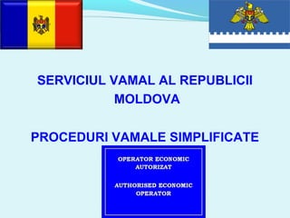 Documentul detaliază procedurile vamale simplificate din Republica Moldova, incluzând cadrul legal și condițiile pentru acordarea statutului de titular al acestor proceduri agenților economici, cum ar fi agenții comerciali cu risc scăzut și transportatorii de încredere. Aceștia beneficiază de facilități precum reducerea controalelor fizice și posibilitatea de vămuire la domiciliu. De asemenea, sunt prezentate condițiile pentru obținerea certificatelor de origine și diverse formulare necesare în procesul vamal.