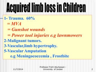 The document outlines various causes and management strategies for traumatic injuries and amputations, detailing conditions such as motor vehicle accidents, gunshot wounds, and birth trauma. It emphasizes techniques for preserving limb length and growth potential, particularly in pediatric cases, and discusses the psychological and functional considerations for juvenile amputees. Additionally, it highlights the importance of surgical approaches and prosthetic fitting to optimize outcomes for young patients.