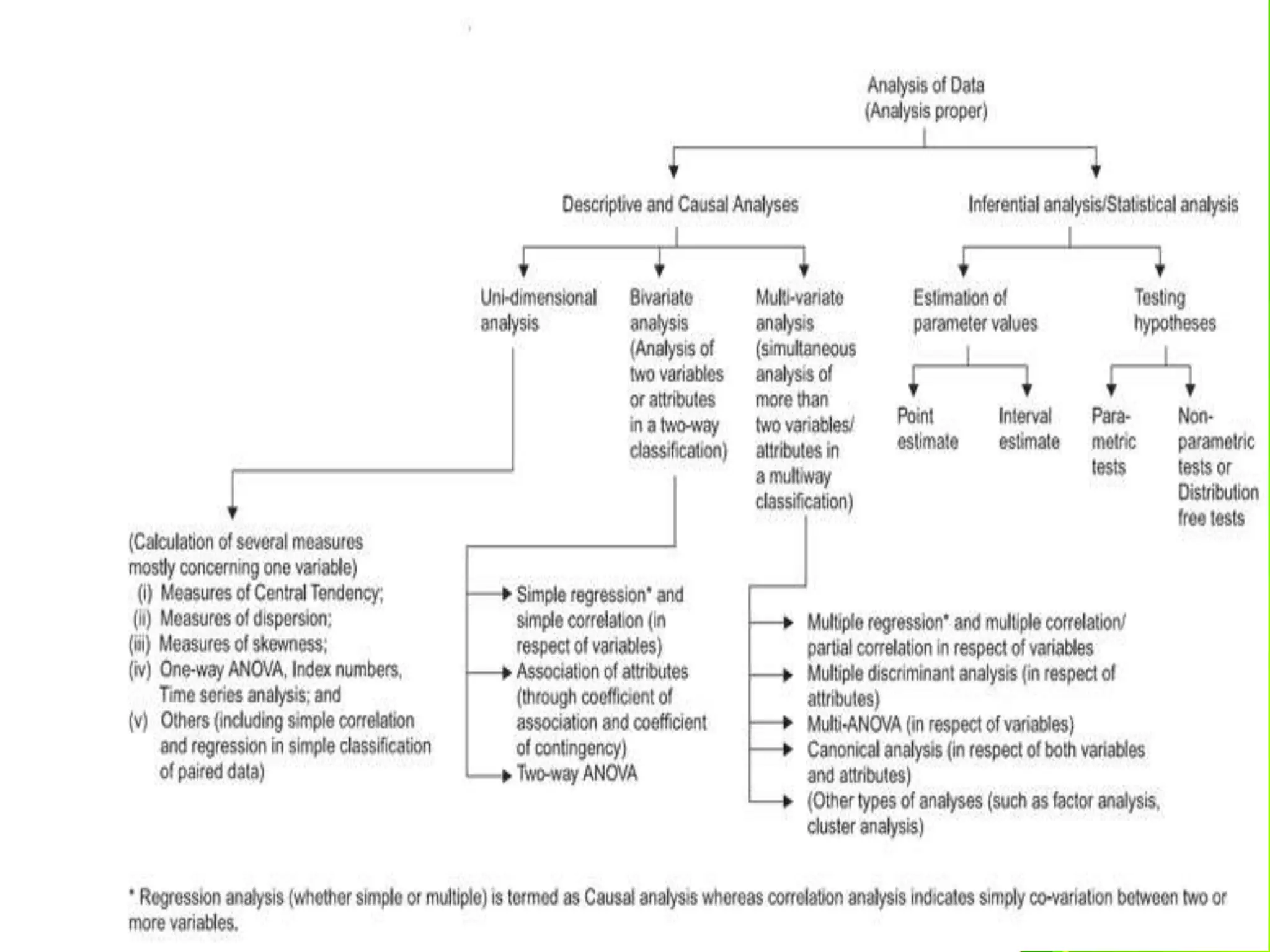 This document discusses different types of data analysis, including descriptive analysis, causal analysis, inferential analysis, univariate analysis, bivariate analysis, and multivariate analysis. Descriptive analysis examines variable distributions to provide profiles and characteristics. Causal analysis assesses relationships between variables. Inferential analysis tests hypotheses and estimates population values. Univariate analysis examines one variable, while bivariate and multivariate analyze two or more variables, including correlation, regression, and ANOVA tests. Parametric tests assume known population parameters, while nonparametric tests do not require known parameters.