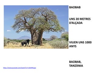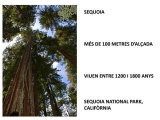 This document discusses two types of trees, the sequoia and the baobab. The sequoia can grow over 100 meters tall, live between 1200-1800 years, and is found in Sequoia National Park in California. The baobab reaches around 20 meters tall, lives approximately 1000 years, and is native to Tanzania.