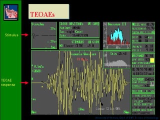 1. Behavioral tests like play audiometry and pure tone audiometry that measure hearing sensitivity. Objective tests like ABR, OAEs, and electrocochleography are used for infants and difficult to test patients.