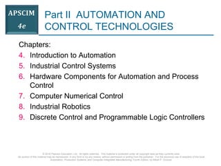Education, Ltd. All rights reserved. This material is protected under all copyright laws as they currently exist. No portion of this material may be reproduced, in any form or by any means, without permission in writing from the publisher. For the exclusive use of adopters of the book Automation, Production Systems, and Computer-Integrated Manufacturing, Fourth Edition, by Mikell P. Groover. Part II AUTOMATION AND CONTROL TECHNOLOGIES Chapters: 4. Introduction to Automation 5. Industrial Control Systems 6. Hardware Components for Automation and Process Control 7. Computer Numerical Control 8. Industrial Robotics 9. Discrete Control and Programmable Logic Controllers