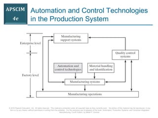 Education, Ltd. All rights reserved. This material is protected under all copyright laws as they currently exist. No portion of this material may be reproduced, in any form or by any means, without permission in writing from the publisher. For the exclusive use of adopters of the book Automation, Production Systems, and Computer-Integrated Manufacturing, Fourth Edition, by Mikell P. Groover. Automation and Control Technologies in the Production System
