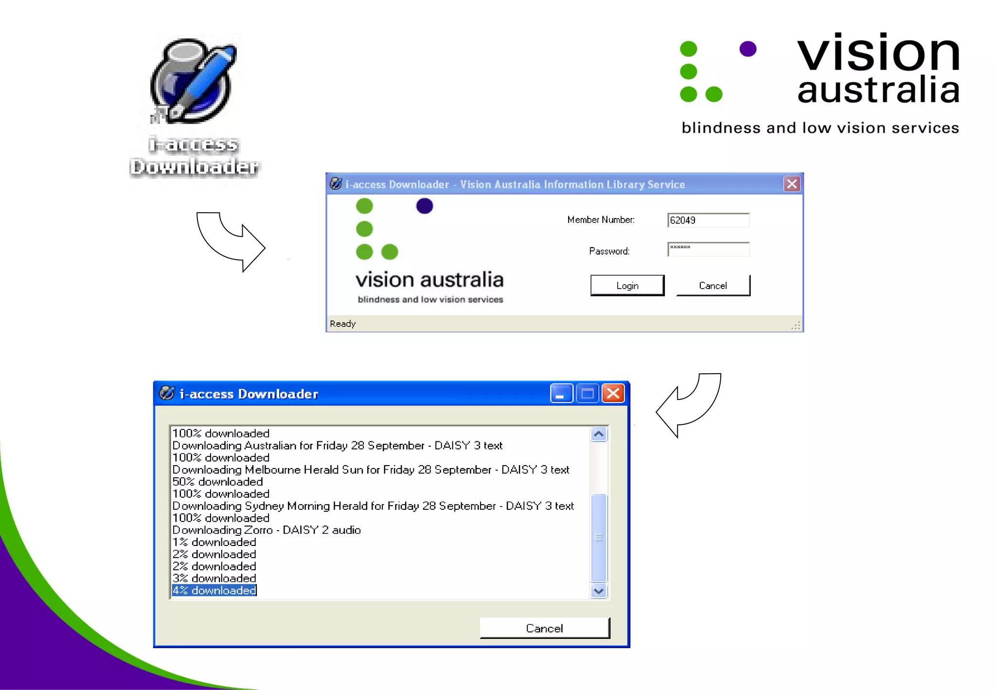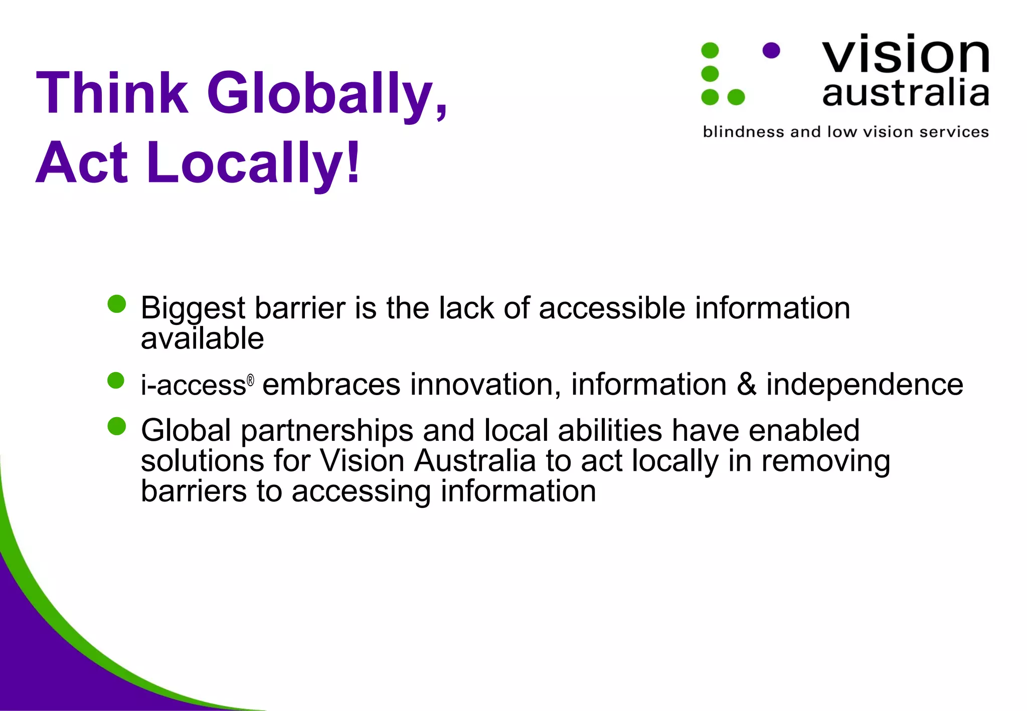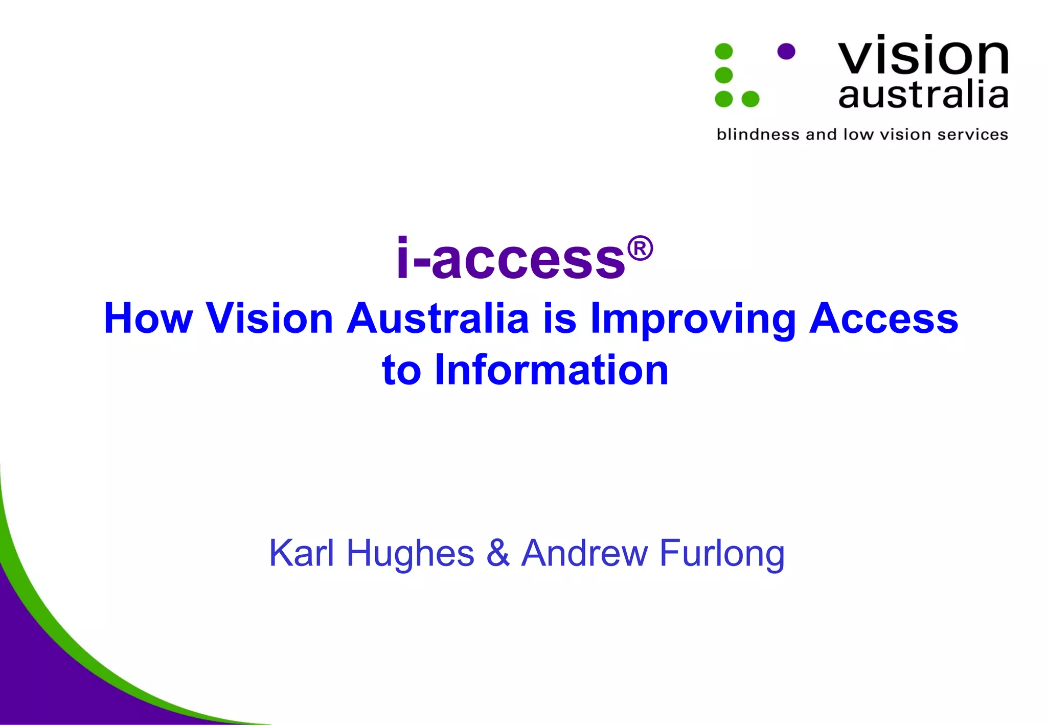 Vision Australia provides services to Australians who are blind or have low vision. Their i-access program aims to improve access to information by creating and acquiring digital audiobooks (DAISY format), storing them in a central repository, and allowing clients to search for, select, and receive titles either online or on compact discs. The service has grown significantly over four years and now includes over 150 newspapers/magazines online, 15,000 audio titles, and the ability to produce braille. Clients benefit from timely access to relevant information, increased choice, and a reading experience similar to sighted users. Ongoing development includes expanding the online collection and automated conversion capabilities.
