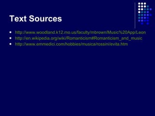 The document provides an overview of Romanticism in music from the 1820s to 1900. It discusses key composers of the era like Beethoven, Chopin, Liszt, and Wagner. It also describes characteristics of Romantic music like an emphasis on emotion, nationalism by incorporating folk tunes, and programmatic music that tells a story. The document argues that the true height of Romanticism in music was from 1815 to 1848, before giving way to musical romantics.