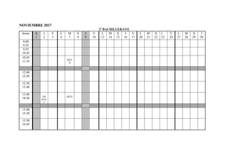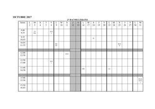 This document contains the class schedule for a student in 2nd year of high school for the months of October and November 2017. It lists the days of the week across the top and the class periods down the side with the corresponding subjects for each time slot. The schedule follows a regular pattern of 5 classes per day from 9am to 4:45pm, with Monday through Friday classes and some subjects meeting twice a week while others only once.