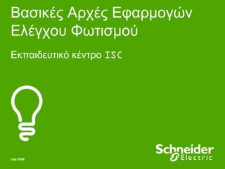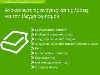 Βασικές Αρχές Εφαρμογών Ελέγχου Φωτισμού Ανακαλύψτε τις ανάγκες και τις λύσεις για τον έλεγχο φωτισμού Κύκλωμα απλού διακόπτη Κύκλωμα διακόπτη αλέ-ρετούρ Έλεγχος φωτισμού από 3 σημεία Έλεγχος φωτισμού από περισσότερα από 3 σημεία Ρελέ Αυτόματοι Κλιμακοστασίου Χρονοδιακόπτες Διακόπτες με φωτοκύτταρο Συνεχής φωτισμός
