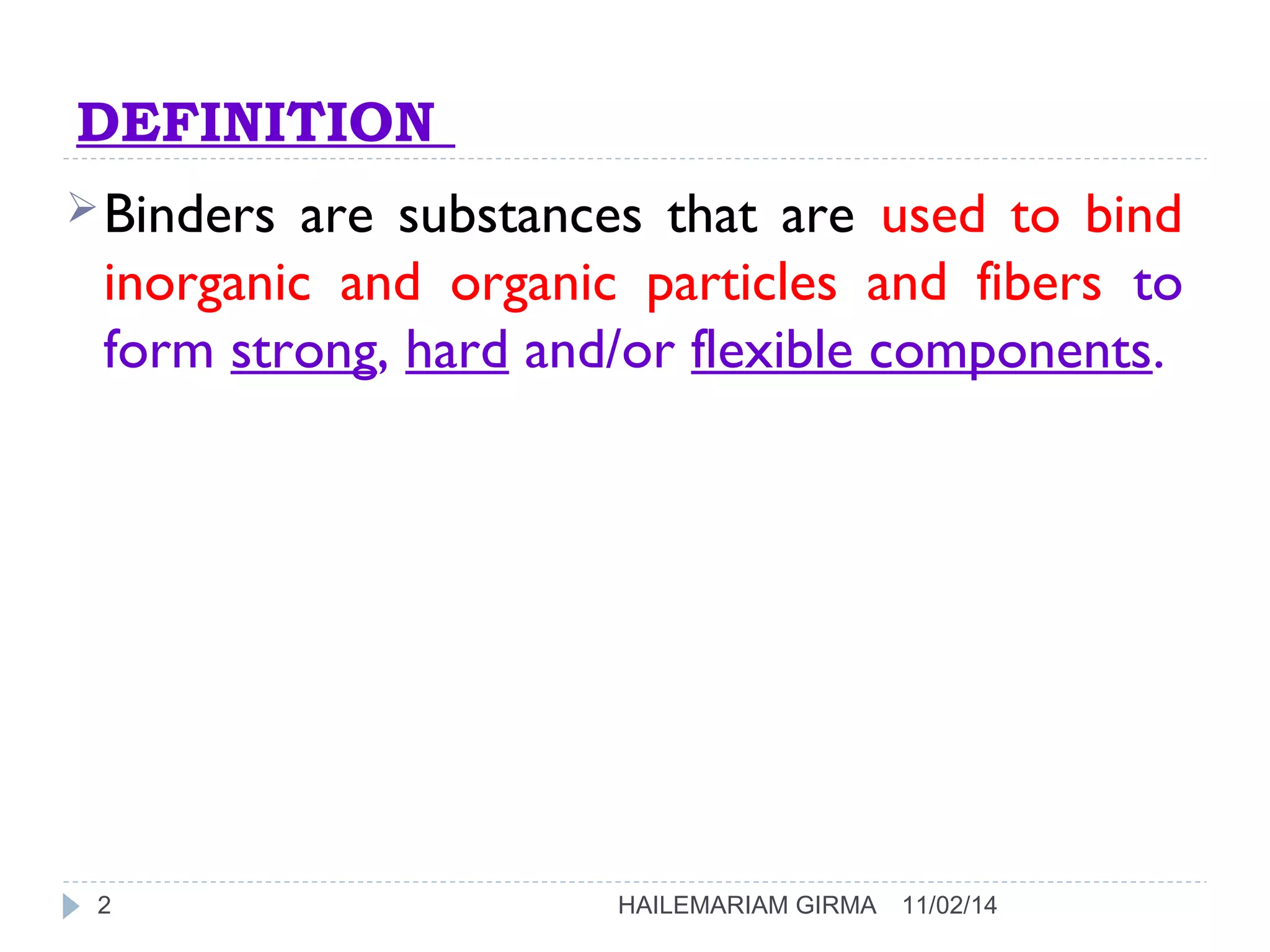 Binders are substances that are used to bind particles and fibers to form strong components. There are three main groups of binders: mineral, bituminous, and synthetic. Mineral binders include lime and gypsum plasters, which are non-hydraulic, and Portland cement, which is hydraulic. Lime is produced by burning limestone and is used as quicklime, hydrated lime, or hydraulic lime. Gypsum plasters include plaster of Paris and hard-finish plaster, which are produced by heating gypsum at different temperatures.
