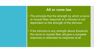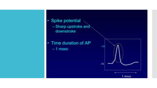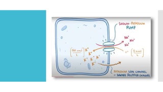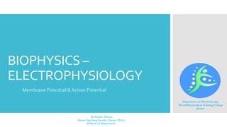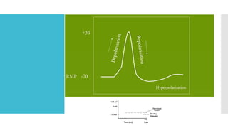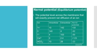 This document provides an overview of membrane potential and action potential, explaining concepts such as resting membrane potential, the role of the sodium-potassium pump, and the Nernst and Goldman equations. It details the factors influencing resting membrane potential, including ion concentration gradients and membrane permeability, as well as the dynamics of action potential. The document emphasizes the variability of resting membrane potential across different cell types and the need for individual ion considerations in calculations.