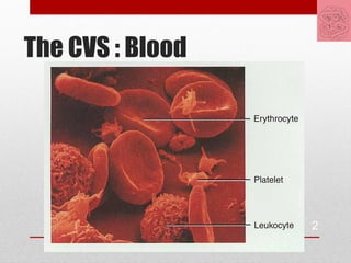 Blood is composed of plasma and formed elements. It transports oxygen, nutrients, wastes, and more throughout the body. Blood also helps regulate pH, temperature, water content, and protects against disease. Blood is made up of red blood cells, white blood cells, platelets, and plasma. Hematopoiesis is the process where blood cells are formed from stem cells in the bone marrow through the influence of growth factors like erythropoietin and thrombopoietin.