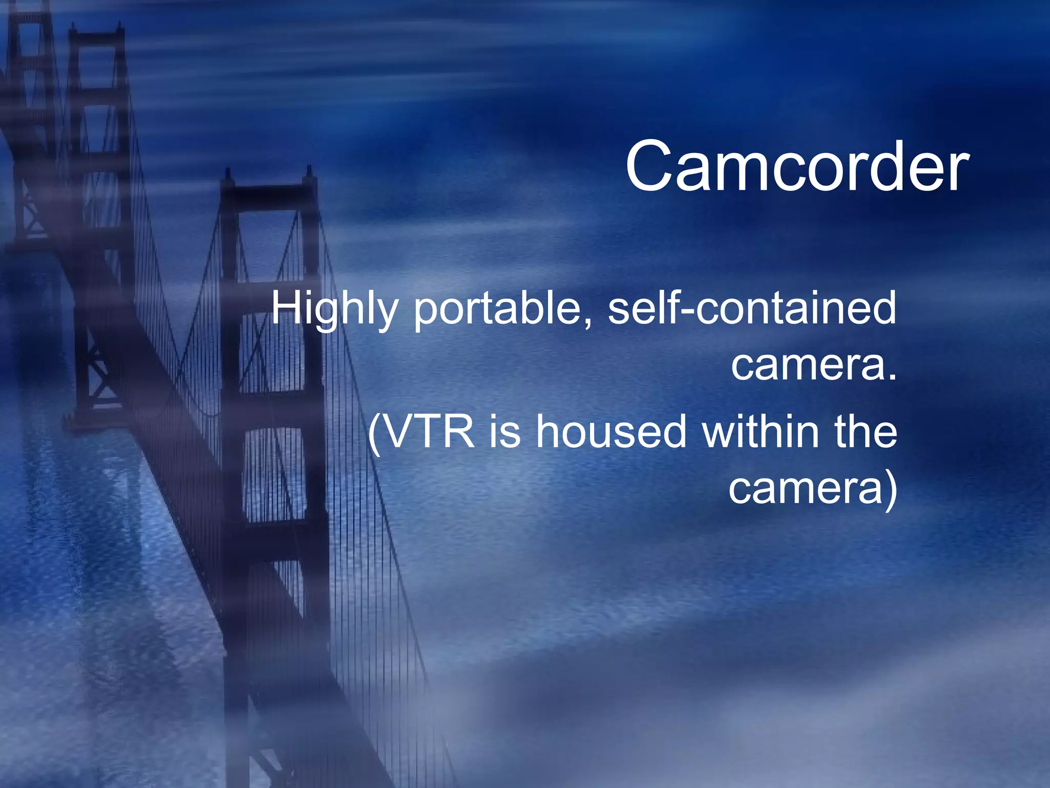 This document describes different types of cameras including camcorders, studio cameras, consumer cameras, prosumer cameras, ENG cameras, DSLR cameras, smartphones, and tablets. It provides details on their key features such as portability, image quality, price point, and use cases. DSLR cameras in particular offer advantages like interchangeable lenses, large image sensors for quality video in low light, and manual controls, but require additional equipment for audio.