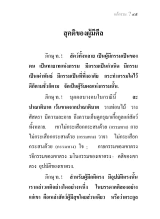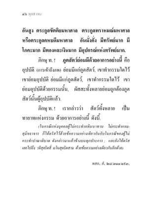... ไดเปนผูใครตอประโยชน ใครตอความเกื้อกูล ใครตอความผาสุข ใครตอความเกษมจากโยคะแกชนเปน อันมากวา “ไฉนชนเหลานีพึงเปนผูเจริญดวยศรัทธา ดวย ้ ศีล ดวยการศึกษา ดวยความรู ดวยการเผือแผ ดวยธรรม ่ ดวยปญญา ดวยทรัพย และขาวเปลือก ดวยนาและสวน ดวยสัตวสองเทาสี่เทา ดวยบุตรภรรยา ดวยทาสกรรมกร และบุรุษ ดวยญาติมิตรและพวกพอง”. เพราะ ... กรรม นั้นๆ ... ครั้นมาสูความเปนมนุษยอยางนี้ จึงไดมหา ปุริสลักขณะ ๓ ขอนี้ คือมีกึ่งกายเบื้องหนาดุจสีหะ, มีหลังเต็ม, มีคอกลม ... ลักขณะที่ ๑๗-๑๘-๒๐, ยอม เปนผูไมเสื่อมเปนธรรมดา คือไมเสื่อมจากศรัทธา ศีล สุตะ จาคะ ปญญา, ไมเสื่อมจากสมบัติทั้งปวง. ฑ. ภิกษุ ท. ! เมื่อตถาคตเกิดเปนมนุษยในชาติ กอน ... ไดเปนผูไมเบียดเบียนสัตวทั้งหลายดวยฝามือ ก็ตาม กอนดินก็ตาม ทอนไมก็ตาม ศัสตราก็ตาม. เพราะ ... กรรมนั้น ๆ ... ครั้นมาสูความเปนมนุษยอยางนี้ จึงไดมหาปุริสลักขณะขอนี้ คือมีประสาทรับรสอันเลิศ มีปลายขึ้นเบื้องบน เกิดแลวที่คอรับรสโดยสม่ําเสมอ ...
