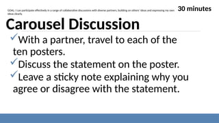 The document outlines a collaborative 'carousel discussion' activity centered on various statements related to themes in 'Oedipus the King'. Participants discuss each statement, leave responses on sticky notes, and later share trends and interesting points with the class. The goal is to enhance discussion skills and articulate personal viewpoints effectively.