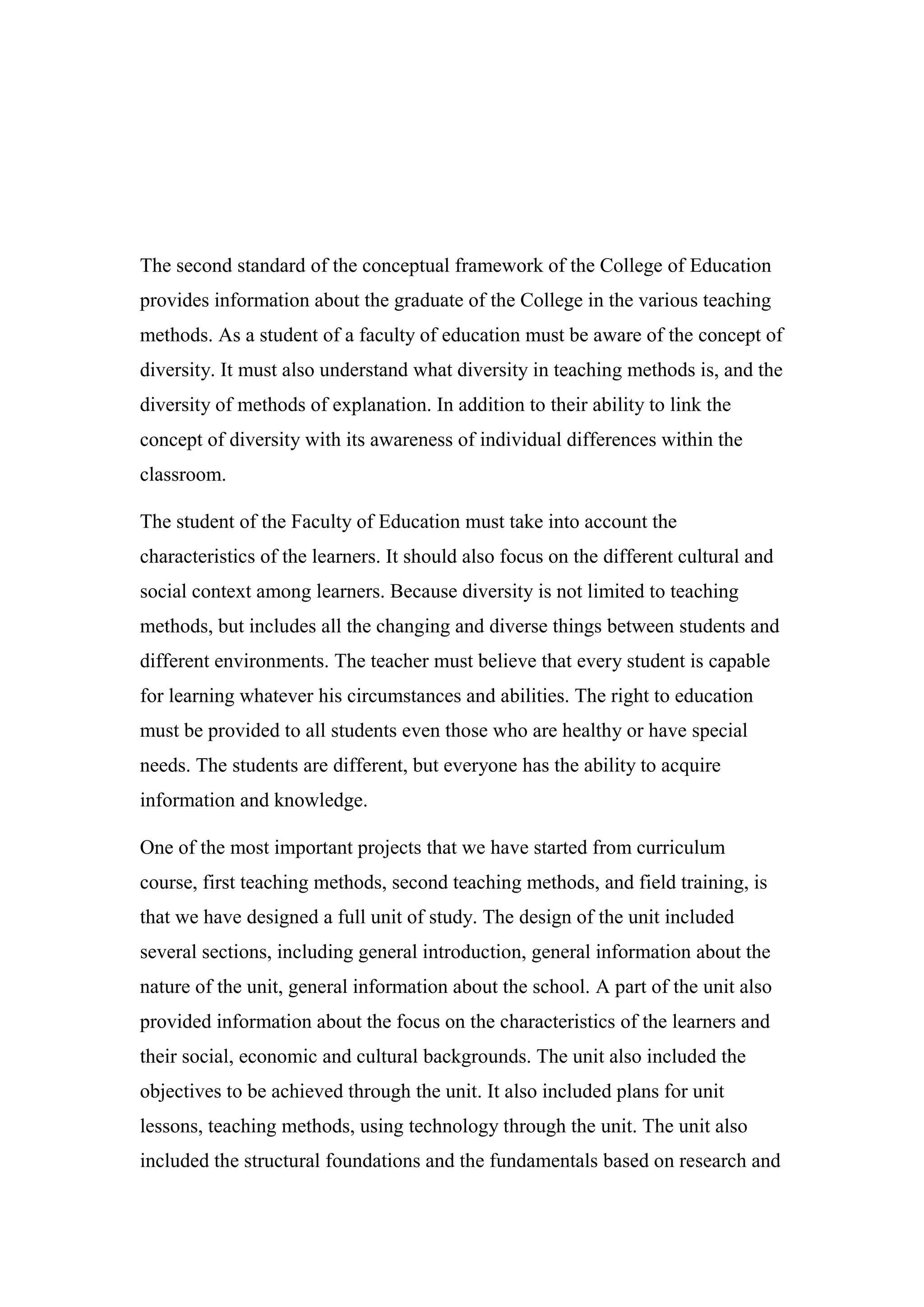 1) The student wrote a reflection paper on applying the second standard of the College of Education's conceptual framework regarding teaching methods and learner diversity through their studies and teaching practicum.