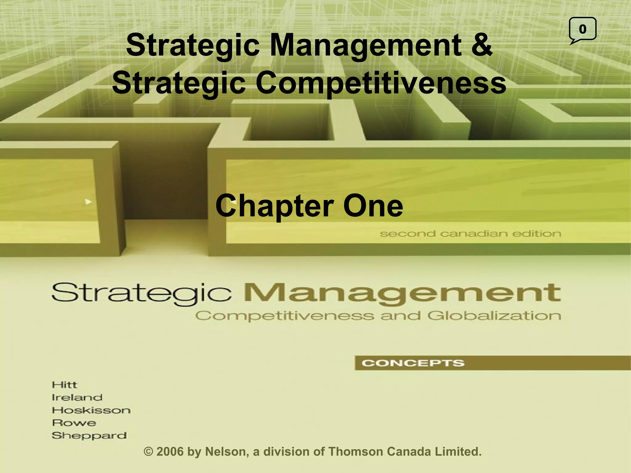 This document provides an overview of strategic management and strategic competitiveness. It defines key terms like strategy, strategic intent, stakeholders, and the strategic management process. The document also discusses factors like globalization, technology, and the importance of developing resources and capabilities for achieving competitive advantage and above-average returns. It describes different models for strategy formulation and implementation, and achieving strategic competitiveness.