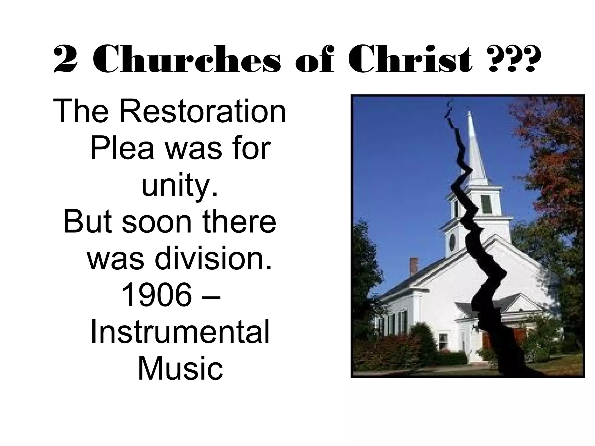 The document outlines that there are two distinct churches of Christ that have emerged. One seeks to faithfully follow the teachings of the New Testament and preach salvation. The other seeks to change doctrine and practices, ignore the Bible, and follow secular trends. A key dividing issue was the introduction of instrumental music in 1906. The document contrasts the differing views between the two churches on issues like the role of women, baptism, and relations with other denominations.