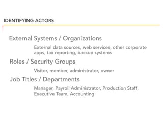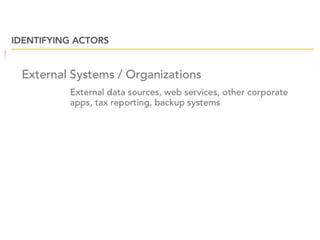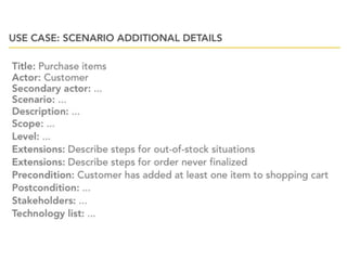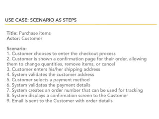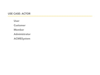 This document provides an overview of class diagrams and use case diagrams in the Unified Modeling Language (UML). It defines key elements of class diagrams like classes, attributes, operations, and relationships. It also explains different types of relationships like association, aggregation, and generalization. The document then discusses use case diagrams and how to identify actors and scenarios. It emphasizes focusing on the user's goal when defining use cases rather than system tasks. Finally, it notes that use case diagrams show multiple use cases and actors to provide system context.