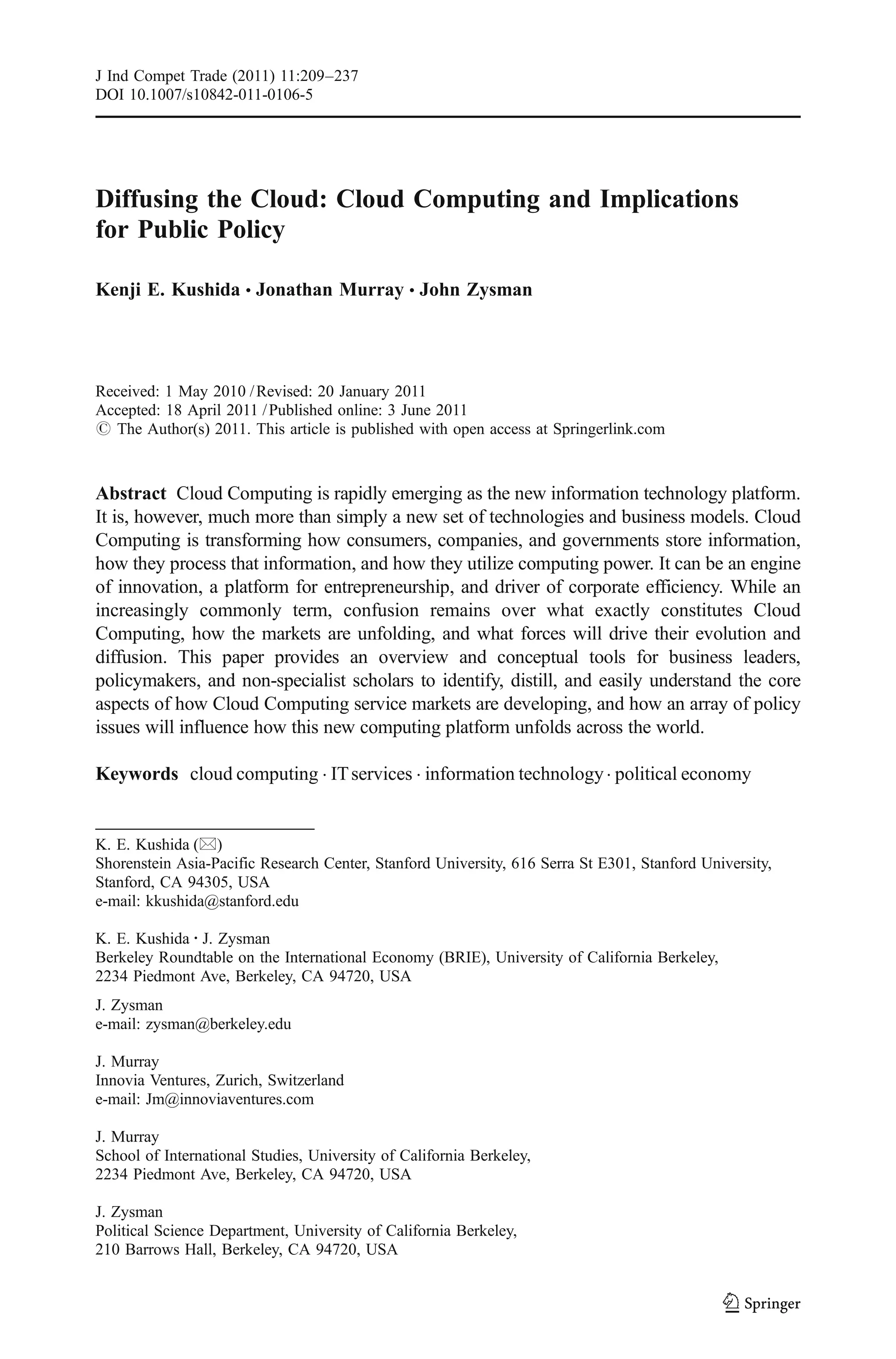 This document provides an overview of cloud computing and its implications for public policy. It defines cloud computing as a "dynamic utility" that delivers computing services via the internet on an as-needed basis. The paper presents a framework for understanding the different types of cloud providers and services, including infrastructure, platform, and applications. It analyzes the business strategies of major cloud providers like Amazon, Google, Microsoft, and Salesforce. Finally, it discusses how cloud computing ecosystems are developing globally and the policy issues countries face as these systems evolve.