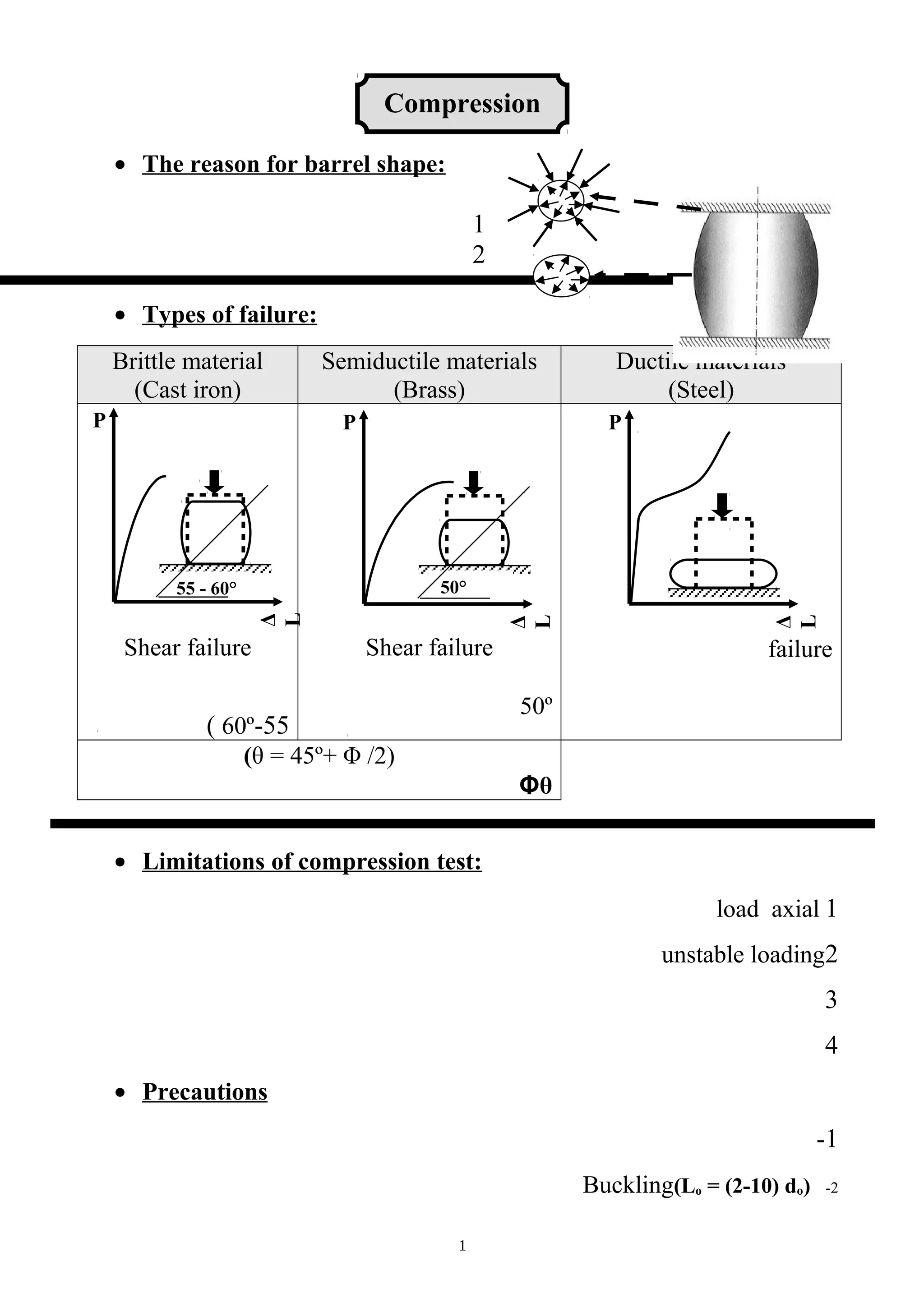 1. It describes the barrel shape of compressed specimens and types of failure under compression.