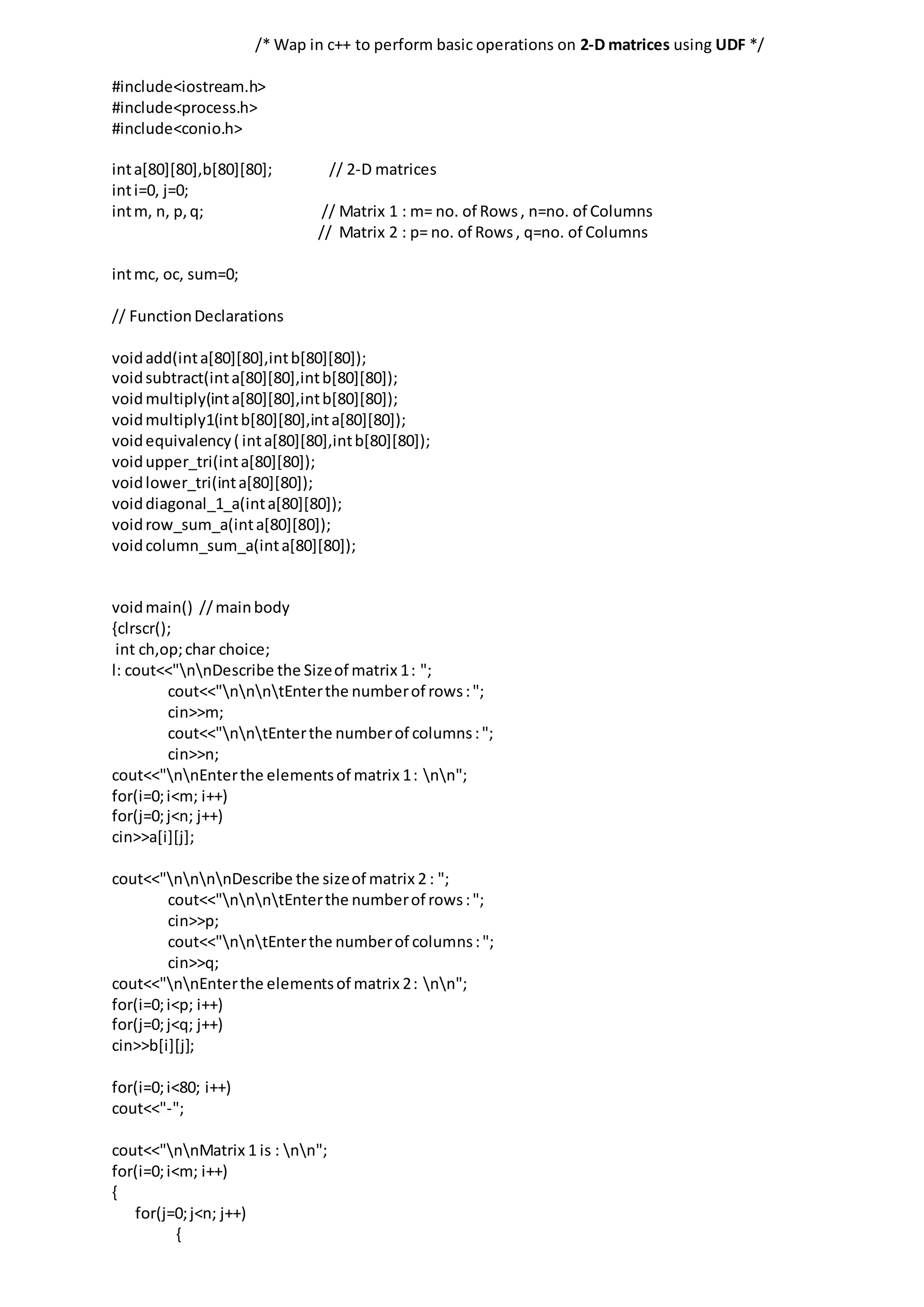 The document describes a C++ program that defines functions to perform various operations on 2D matrices including addition, subtraction, multiplication, checking equivalence, and displaying the upper/lower triangular portions. The main function gets the size of two matrices from the user, inputs the elements, displays a menu of options to perform the different operations, and calls the appropriate functions based on the user's selection.