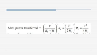3. Examples are provided to demonstrate applying the theorems to solve for unknown currents and voltages in circuits. The maximum power transfer theorem states that maximum power is transferred when the load resistance equals the internal resistance of the source.