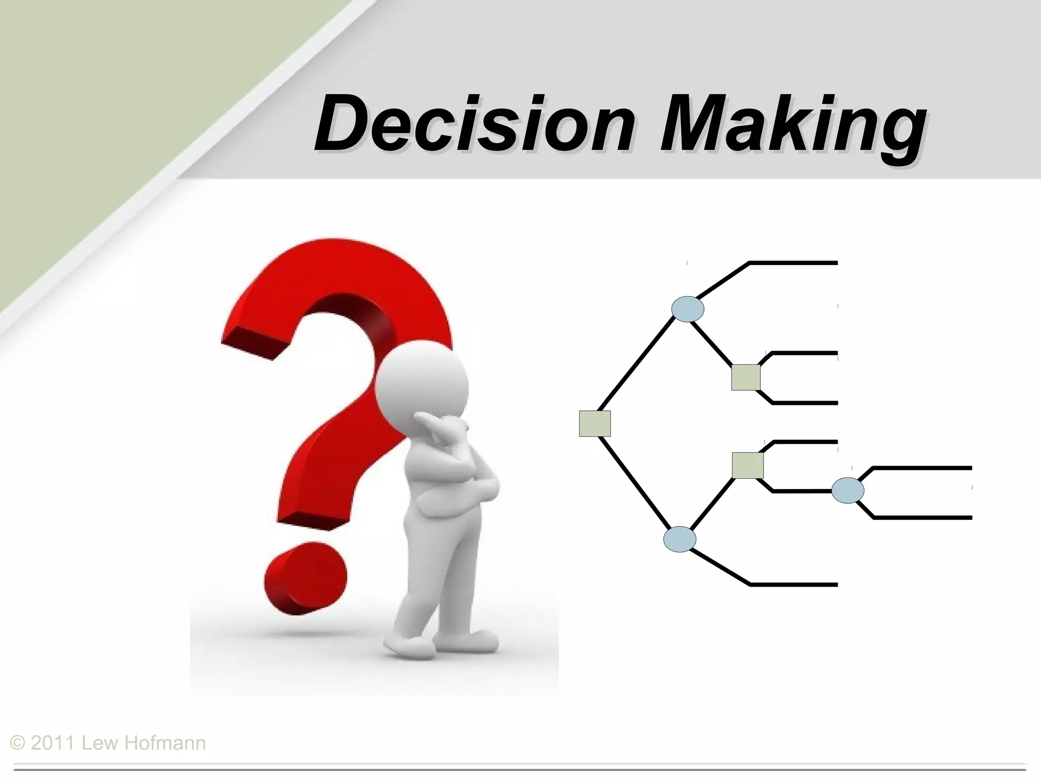 The document discusses various decision making techniques including break-even analysis, preference matrices, and payoff tables. Break-even analysis is used to determine the sales volume needed for total revenue to equal total costs. Preference matrices allow alternatives to be evaluated based on weighted criteria. Payoff tables can be used under uncertainty when the probabilities of different outcomes are unknown. Maximizing the highest potential payoff is one approach, known as maximax.