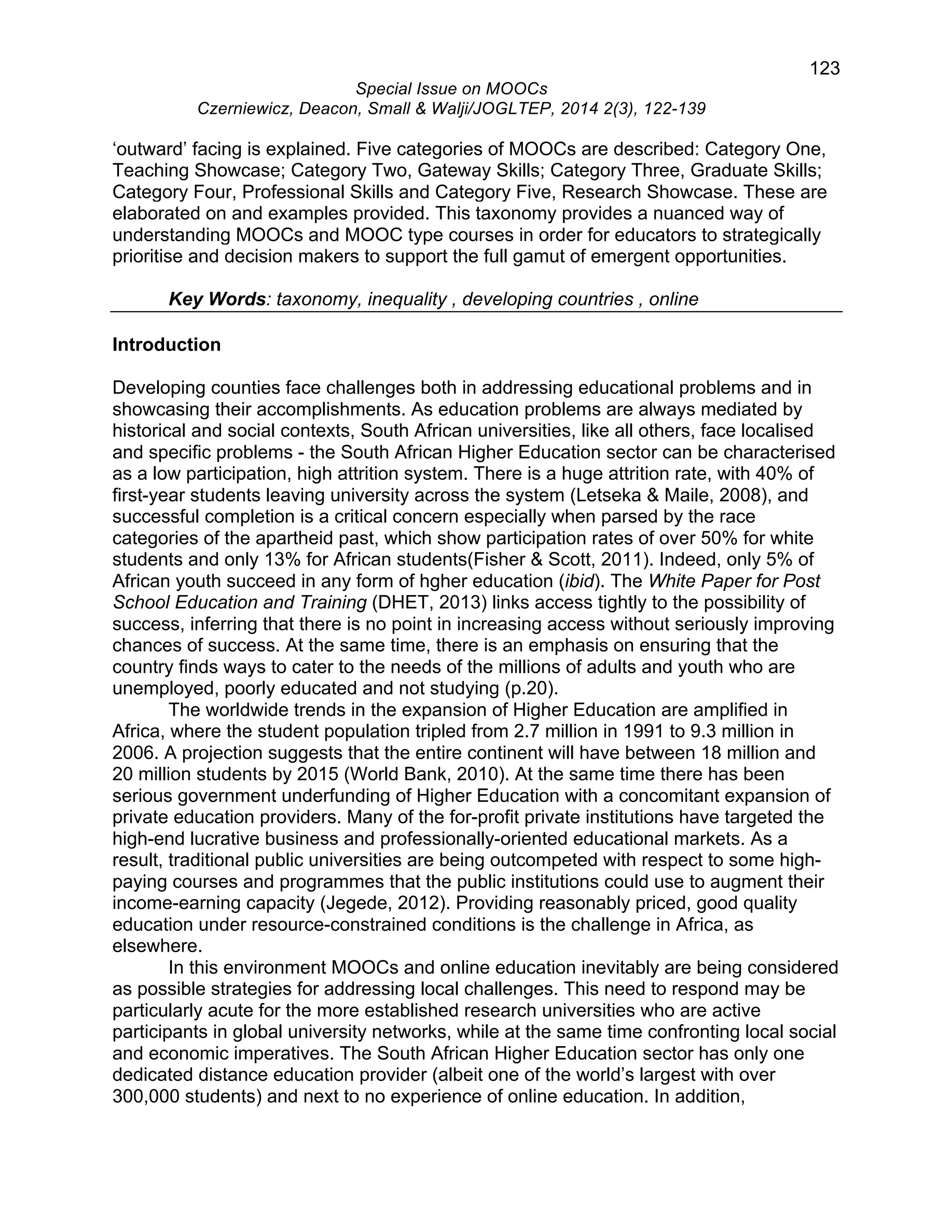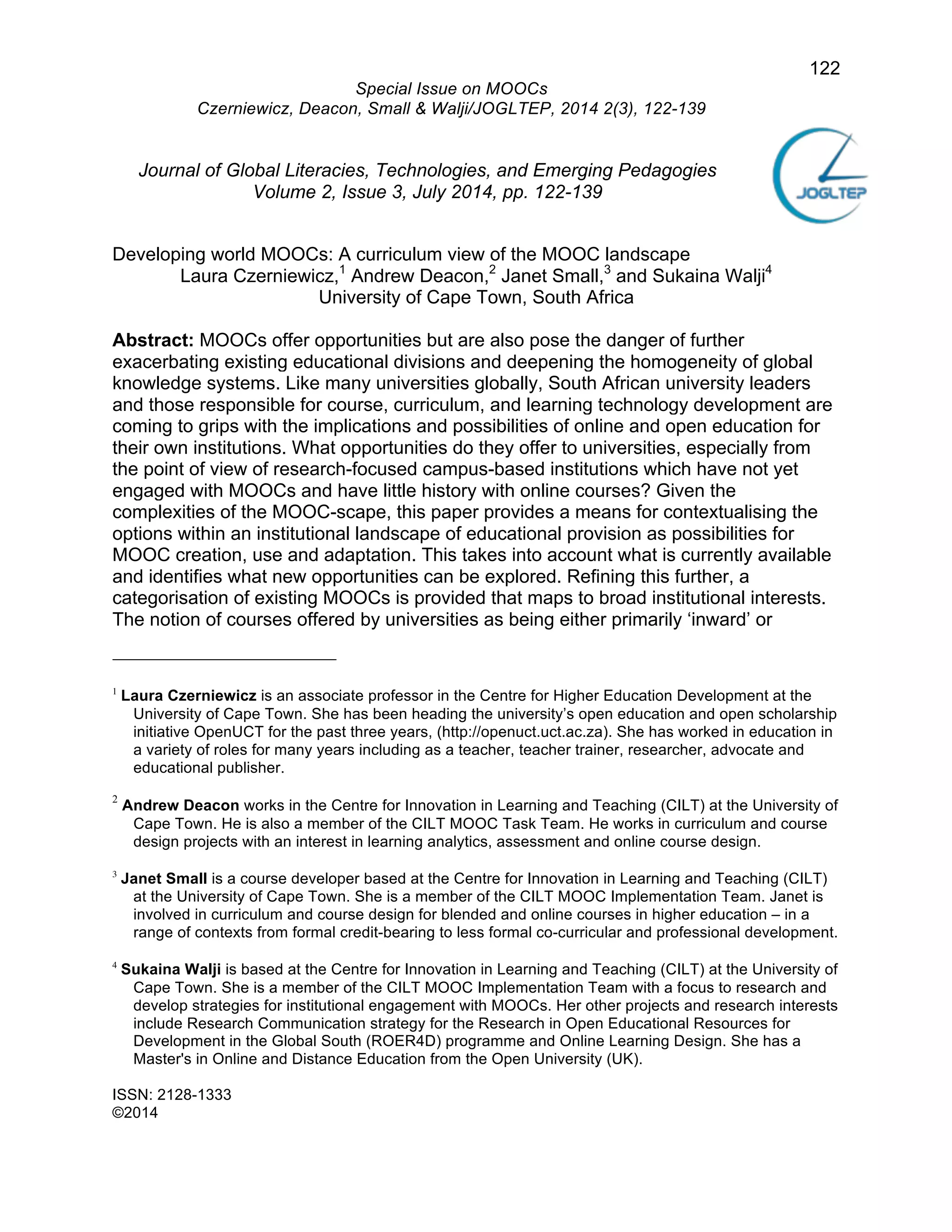 The paper examines the implications and opportunities of MOOCs in the context of South African universities, highlighting the potential for online education to address educational inequalities and enhance local knowledge systems. It categorizes existing MOOCs into five types and discusses the challenges faced by institutions that have yet to engage with this model of education. The authors emphasize the need for strategic approaches to MOOC development that respect local contexts while considering the broader institutional landscape.