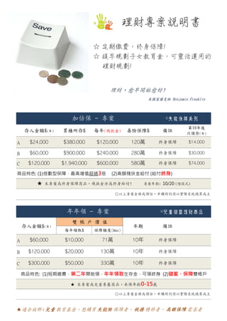 ☆ 定期繳費,終身保障! ☆ 提早規劃子女教育金,可靈活運用的 理財規劃! 理財,愈早開始愈好! 美國富蘭克林 Benjamin Franklin 加倍保 - 專案 ©失能保障系列 第10年後 存入金額$(年) 累積所存$ 每年(殘扶金) 壽險保障$ 備註 只須存(年) A $24,000 $380,000 $120,000 120萬 終身保障 $14,000 B $60,000 $900,000 $240,000 280萬 終身保障 $30,000 C $120,000 $1,940,000 $600,000 580萬 終身保障 $74,000 商品特色: (1)倍數型保障,最高增值超過3倍 (2)高額殘扶金給付 (給付終身) ★ 本專案為終身保障商品,殘扶金亦為終身給付! 專案年期: 10/20 (階段式) ◎以上專案金額為預估,申購時仍須以實際系統精算為主 年年領 - 專案 ©兒童儲蓄理財商品 雙 帳 戶 價 值 存入金額$(年) 年期 備註 每年領取$ 保障額度(Max) A $60,000 $10,000 71萬 10年 終身保障 B $120,000 $20,000 130萬 10年 終身保障 C $300,000 $50,000 330萬 10年 終身保障 商品特色: (1)短期繳費,第二年開始領,年年領取生存金,可領終身 (2)儲蓄、保障雙帳戶 ★ 本專案為兒童專屬商品,承保年齡0-15歲 ◎以上專案金額為預估,申購時仍須以實際系統精算為主 ★適合族群: 兒童 教育基金、想購買 失能險 保障者、 稅務 轉移者、 高額保障 需求者