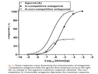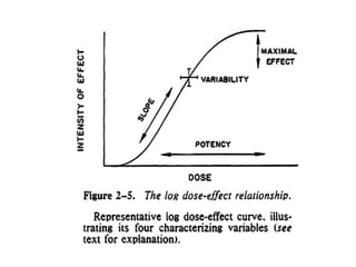 The document discusses key concepts related to dose-response relationships for drugs. It defines important terms like dose, response, and dose-response curves. It explains that the dose-response relationship depends on multiple factors and describes the difference between main and side effects. Additionally, it provides details about graded and quantal dose-response curves and their characteristics. Metrics like potency, efficacy, slope, and variability that are used to analyze dose-response relationships are also outlined.