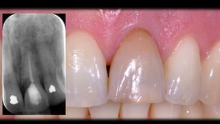- Examination found recession on teeth 11 and 21, with root resorption and discoloration on 21.