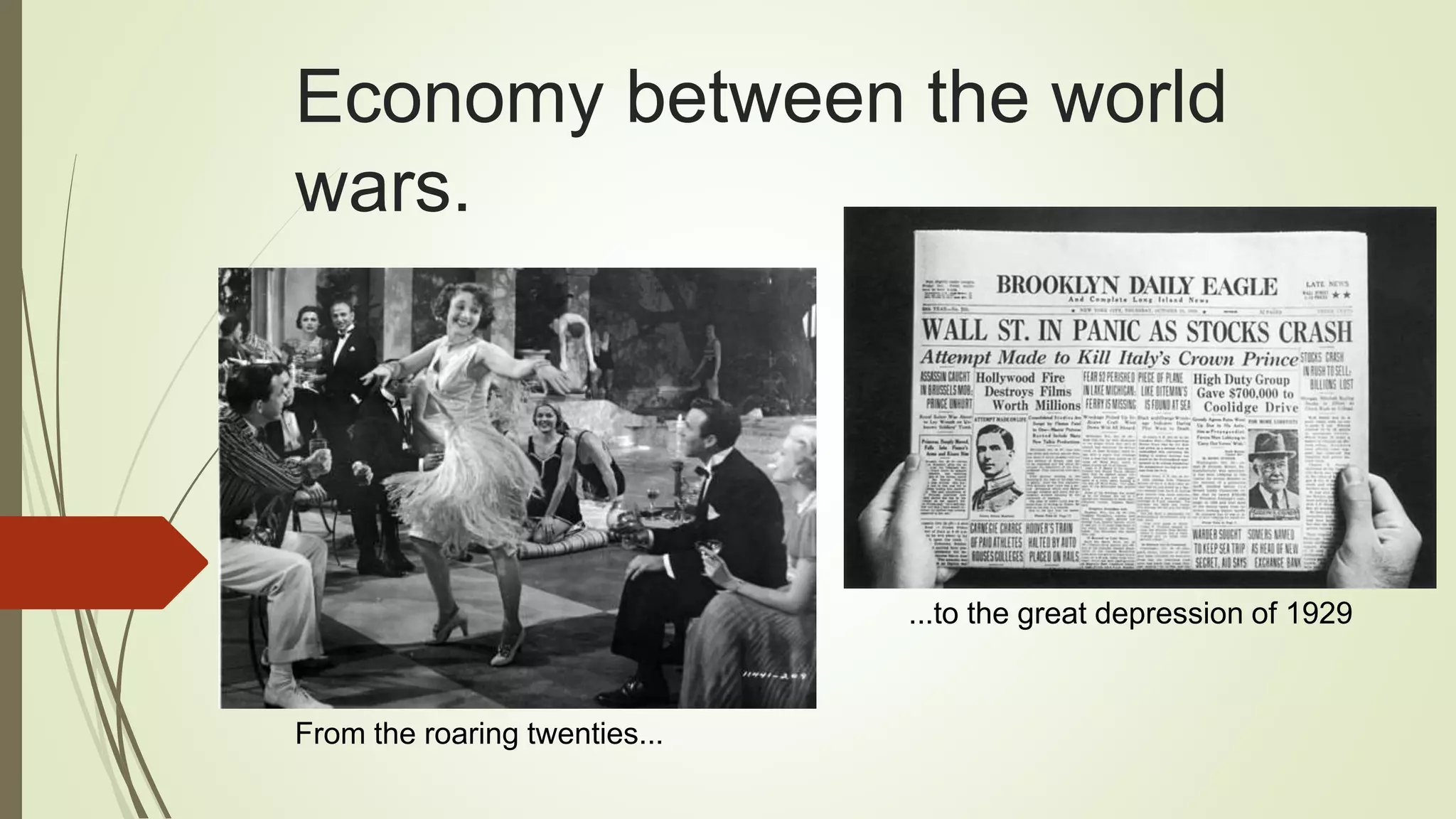 The document summarizes the economy between World Wars I and II, from the prosperous "Roaring Twenties" to the onset of the Great Depression in 1929. It describes the economic boom in the 1920s driven by mass production, consumption, and stock market investments. However, overproduction led to declining sales and prices by 1929. Widespread stock sell-offs caused prices to plummet on "Black Thursday," October 24, 1929, plunging the US and Europe into the Great Depression characterized by high unemployment, business failures, and lack of credit and demand.