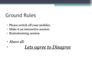 This document provides information on effective communication. It begins by establishing ground rules for an interactive session and brainstorming. It then lists various aspects of communication such as verbal and non-verbal communication, facial expressions, body language, listening skills, and dressing sense. It discusses managing conflicts and positive interactivity. It defines communication and provides the steps in the communication process. It outlines the basics of effective communication and describes passive, aggressive, and assertive styles of communication.