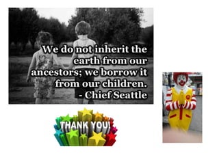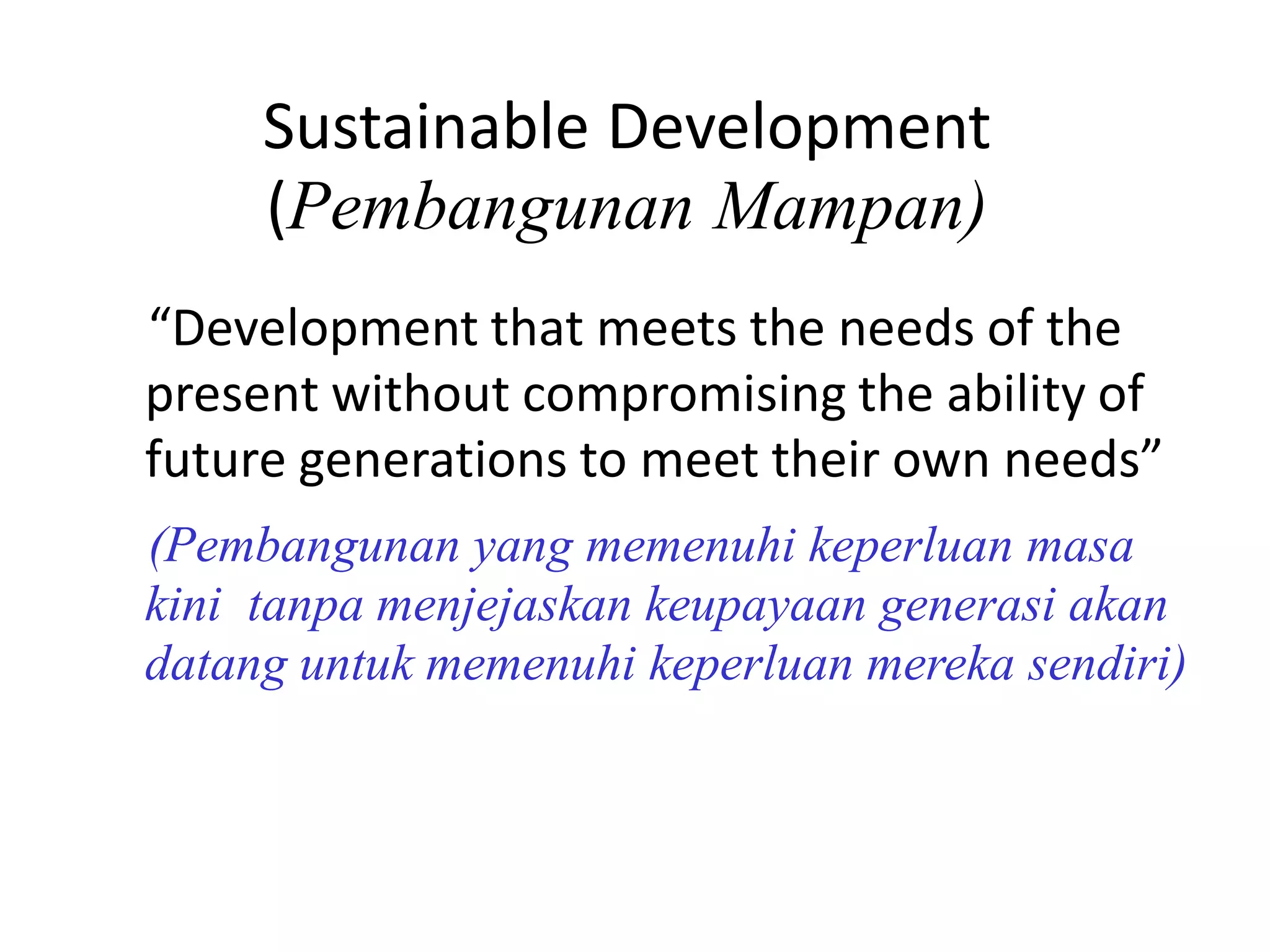 This document discusses sustainable development and the environment. It defines sustainable development as "development that meets the needs of the present without compromising the ability of future generations to meet their own needs." It also defines key environmental terms like "environment" and "environmental aspect." The document notes that an environmental management system is part of an organization's management system used to manage environmental aspects, natural resources, compliance obligations, and risks/opportunities. It emphasizes the importance of following procedures to prevent pollution, waste of resources, noncompliance, and leaving a degraded environment for future generations.