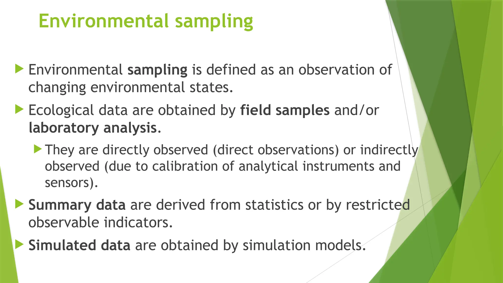 Environmental sampling involves observing changing environmental states through direct or indirect observations, utilizing various data capture and processing methods. Recommendations for effective sampling include formulating clear data collection goals, understanding variability sources, and ensuring representative samples through statistical analysis. Composite sampling is vital for estimating average values over time, while grab sampling focuses on immediate performance indicators, each having distinct advantages and disadvantages.