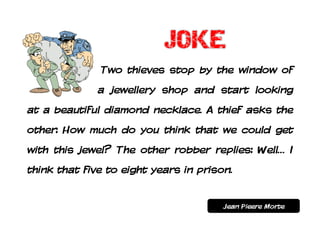 Two thieves look at a diamond necklace in a jewelry shop window but one thief notes they would likely get 5-8 years in prison if they stole it.