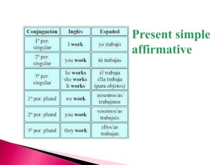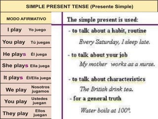 The document contains information about English grammar concepts such as verbs, adverbs of frequency, questions, and negatives in the present simple tense. It provides examples of how to conjugate regular verbs, use adverbs like always and never to describe how often an action occurs, form yes/no and wh- questions, and make sentences negative using don't or doesn't. There are exercises for students to practice these grammar structures in short interactive activities.