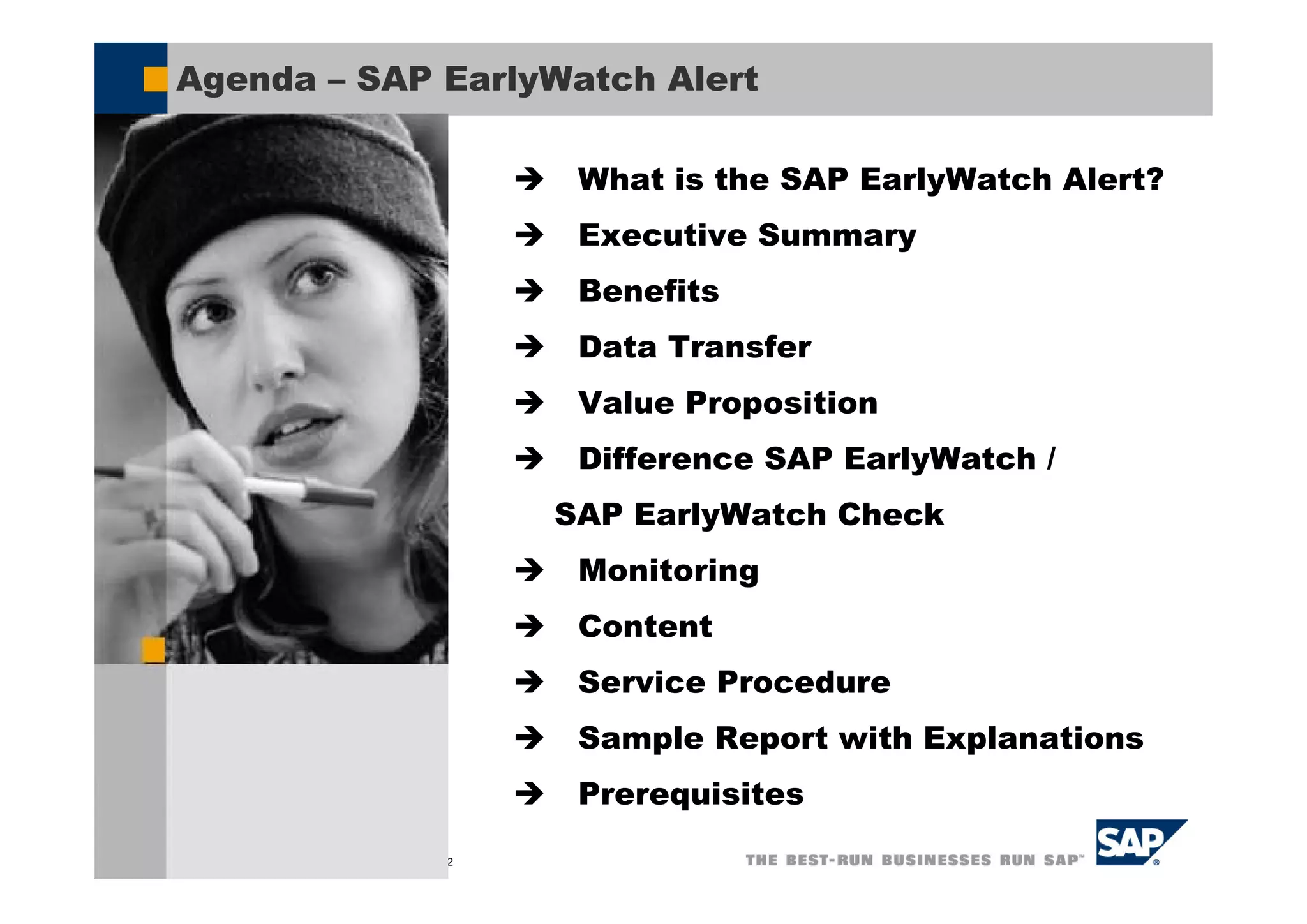 The SAP EarlyWatch Alert identifies potential problems in SAP systems at an early stage by monitoring regularly collected system data. It analyzes this data and provides a report of any issues found. This helps customers optimize system performance and prevent downtime. The report contains summaries of the system configuration, performance, workload distribution, operations, hardware capacity, database performance, administration, and trends over time. Customers must have an RFC connection enabled between their SAP system and SAP Solution Manager for EarlyWatch Alert monitoring.