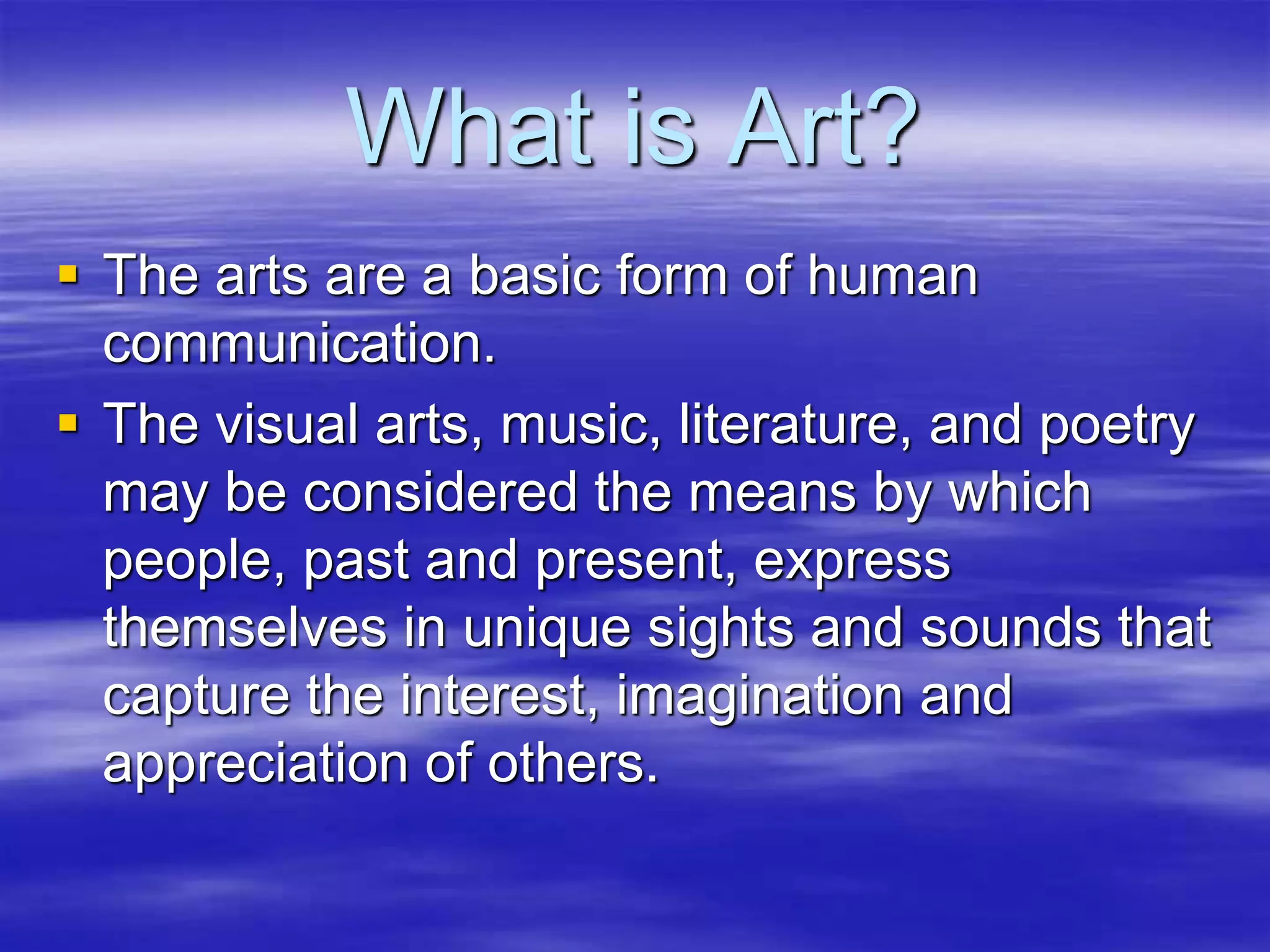 This document discusses what art is and different forms of art. It defines art as a means of human communication that expresses ideas and feelings. There are two primary forms: fine art which has no practical purpose and applied art which serves a functional purpose. The document also discusses why art is created, including for aesthetics, morals, spirituality, history, and politics. It explains that artists are driven by an impulse to create regardless of their culture. The document advocates for studying art because it allows for self-expression, decision making, problem solving, and makes real-world connections.