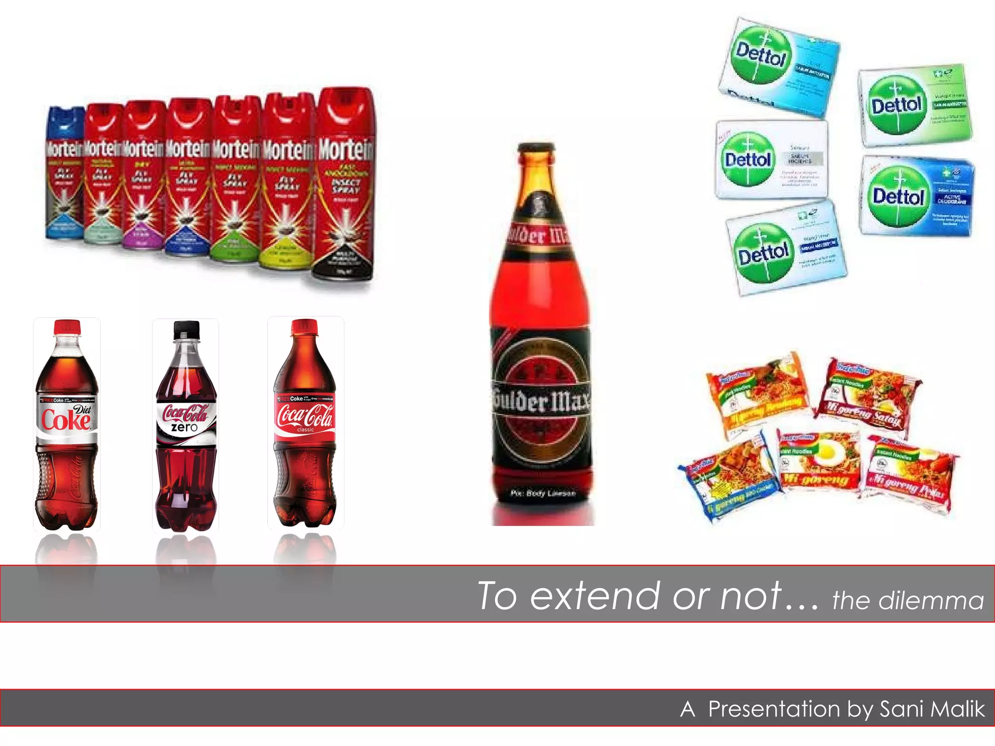 The document discusses brand extensions and line extensions as strategies for introducing new products. It defines line extensions as modifications within an existing product category, like new flavors, while brand extensions enter new categories. Extensions can reduce risks for new products by leveraging brand recognition. However, extensions must be differentiated from parent brands and satisfy consumers to avoid damaging the brand or creating competition. The document recommends that extensions have attributes relevant to target consumers, be positioned distinctly from parent brands, and deliver a proposition different than the parent brand. Whether an extension will succeed depends on properly executing these factors.