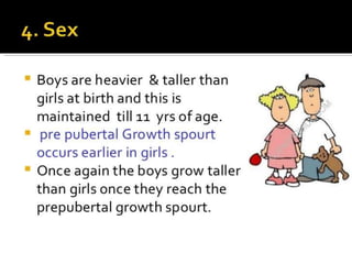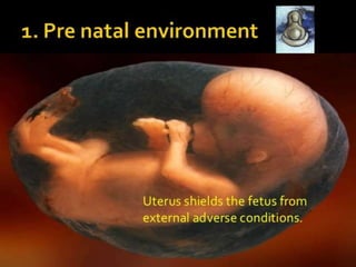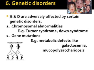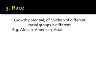 This document discusses child growth and development. It defines growth as a quantitative change that results in increased size and weight through cell division and protein synthesis. Development is defined as a qualitative change that involves the gradual expansion of capacities through maturation and learning. The document outlines several factors that can affect child growth and development, including prenatal factors like maternal nutrition, stress, illness and placental function, as well as postnatal influences such as nutrition, infections, trauma, socioeconomic status, family dynamics and access to healthcare services.