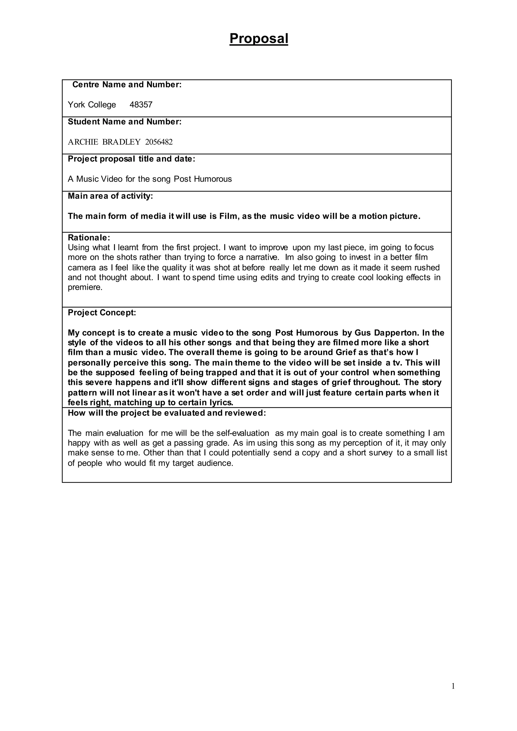 Archie Bradley proposes creating a music video for the song "Post Humorous" by Gus Dapperton. The video will be filmed using a better quality camera to improve upon Bradley's previous work. The concept is to portray different stages of grief through scenes set inside a television, representing feeling trapped and lacking control during severe hardship. Bradley will evaluate the project based on self-satisfaction and receiving a passing grade, as the interpretation of the song's theme is personal. Over nine weeks, tasks will include research, pre-production planning, production shoots, and editing to complete the video for final self-evaluation.