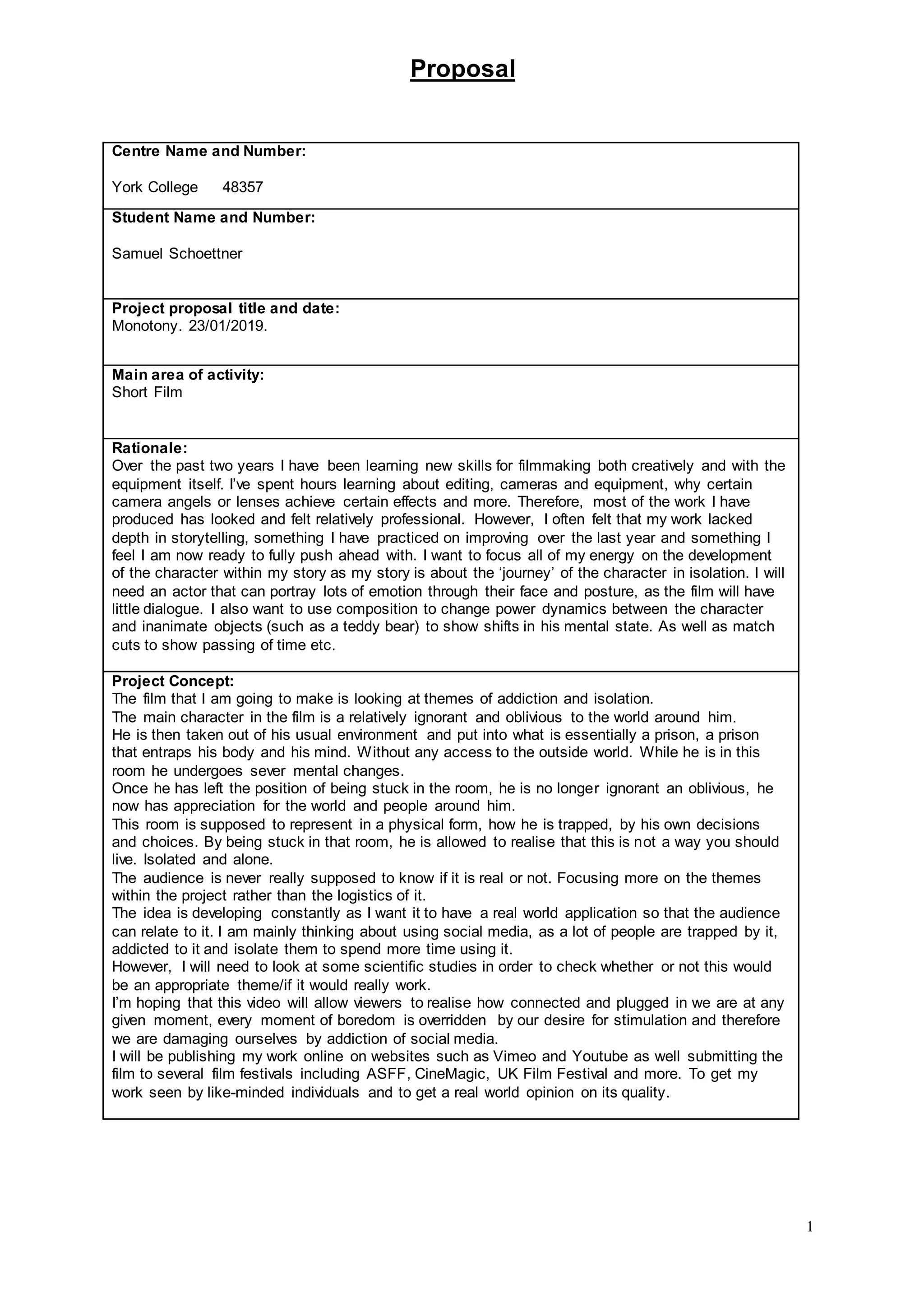 Samuel Schoettner proposes a short film project titled "Monotony" exploring themes of addiction and isolation. He will focus on developing the character and using camera techniques like match cuts to show the passage of time. The main character will undergo mental changes after being trapped alone in a room, meant to represent how one can feel trapped by addiction. Over 20 weeks, Samuel will complete pre-production tasks like research, experiments, and planning, then production including filming, editing, and post-production, followed by evaluation, presentation, and a final screening. He aims to submit the film to festivals and publish it online.