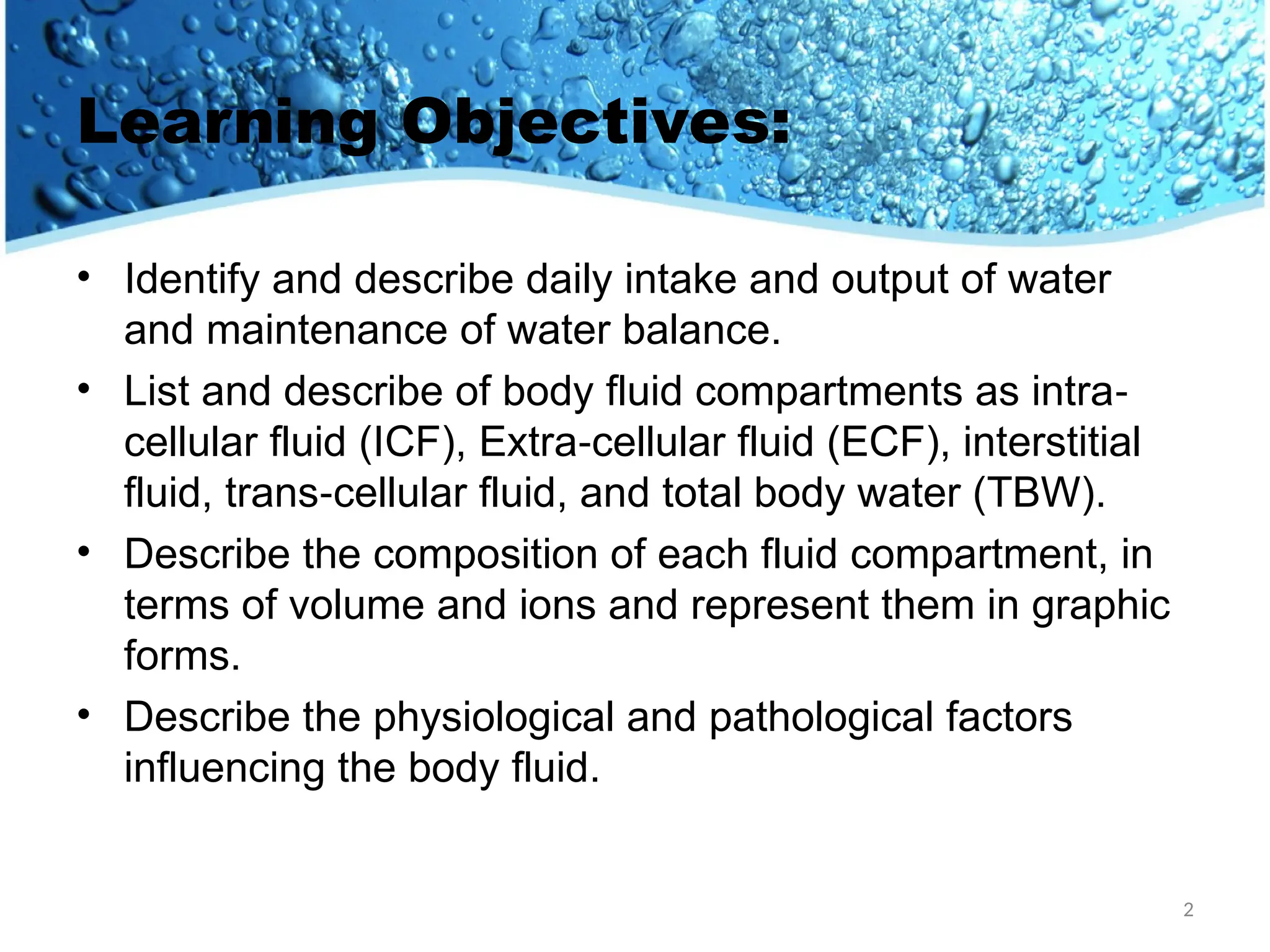 The document outlines the composition and balance of body fluids and electrolytes, detailing the distribution of water in different compartments of the body and the factors affecting water balance. It emphasizes the significance of sodium and potassium regulation in maintaining electrolyte homeostasis and the physiological adaptations throughout different life stages. Moreover, it describes various fluid compartments and their ionic composition, as well as the effects of pathological conditions on body water levels.
