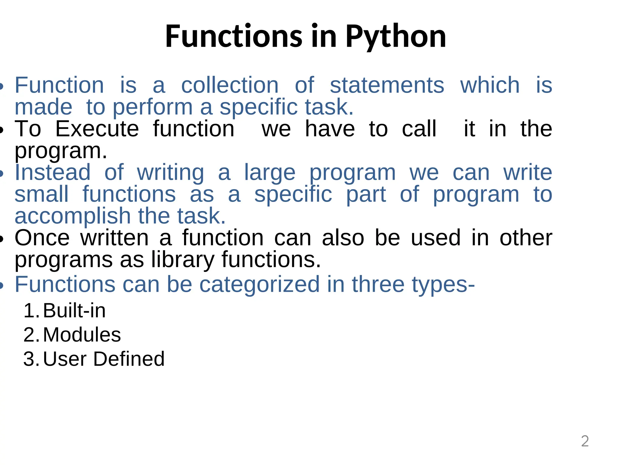 The document provides an overview of functions in Python, explaining their types (built-in, user-defined, and modules) and various built-in functions such as type conversion, input handling, and string manipulation. It also discusses user-defined functions, including syntax, arguments, and the concept of recursion. Additionally, the document touches on modules, their usage in structuring code, and different types of arguments supported by Python functions.