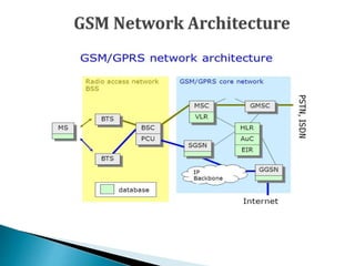 2) GSM networks consist of a Network Switching Subsystem (NSS), Base Station Subsystem (BSS), and Mobile Station (MS). The NSS includes components like the MSC, HLR, VLR that manage calls and subscriber data. The BSS includes the BSC and BTS to handle radio transmissions.