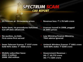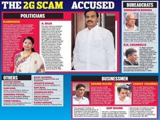 The document summarizes information about the 2G spectrum scam in India, including details about the individuals and corporations involved. Politicians like A. Raja and Kanimozhi, as well as businesspeople like Anil Ambani, Ratan Tata, and lobbyist Nira Radia are alleged to have participated in the scam, which illegally undercharged mobile companies for licenses, resulting in an estimated loss of $29 billion to the Indian exchequer. Corporations like Unitech and Swan Telecom are accused of receiving licenses without qualifications. Key individuals face criminal charges including breach of trust and corruption.